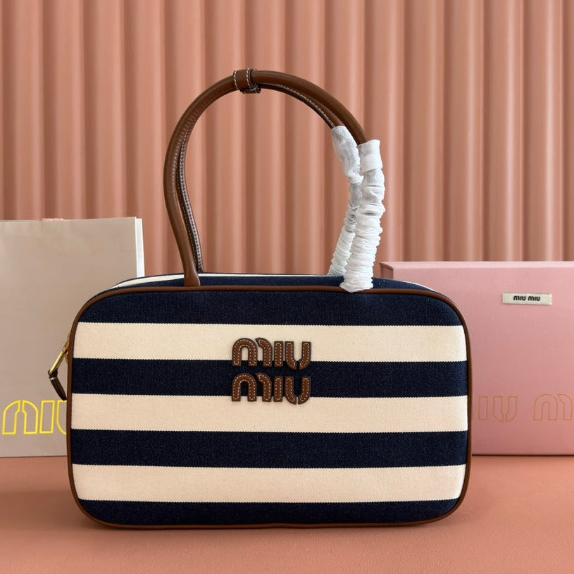 Miu Beau Medium Bag 34cm Soft Beige Dark Navy Blue Cotton Brown Cowhide 257963