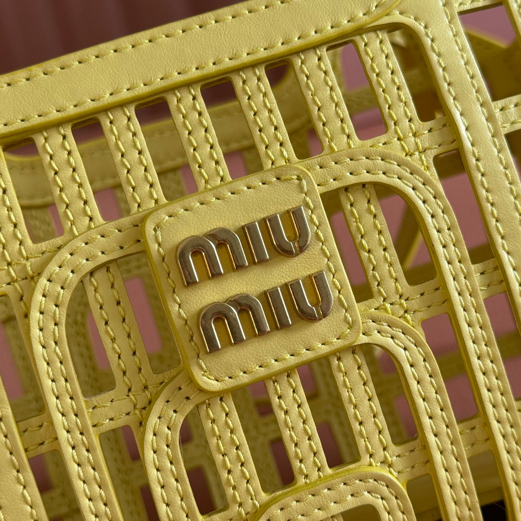 Miu Leather Basket Bag 24cm Lemon Yellow Cowhide 255473