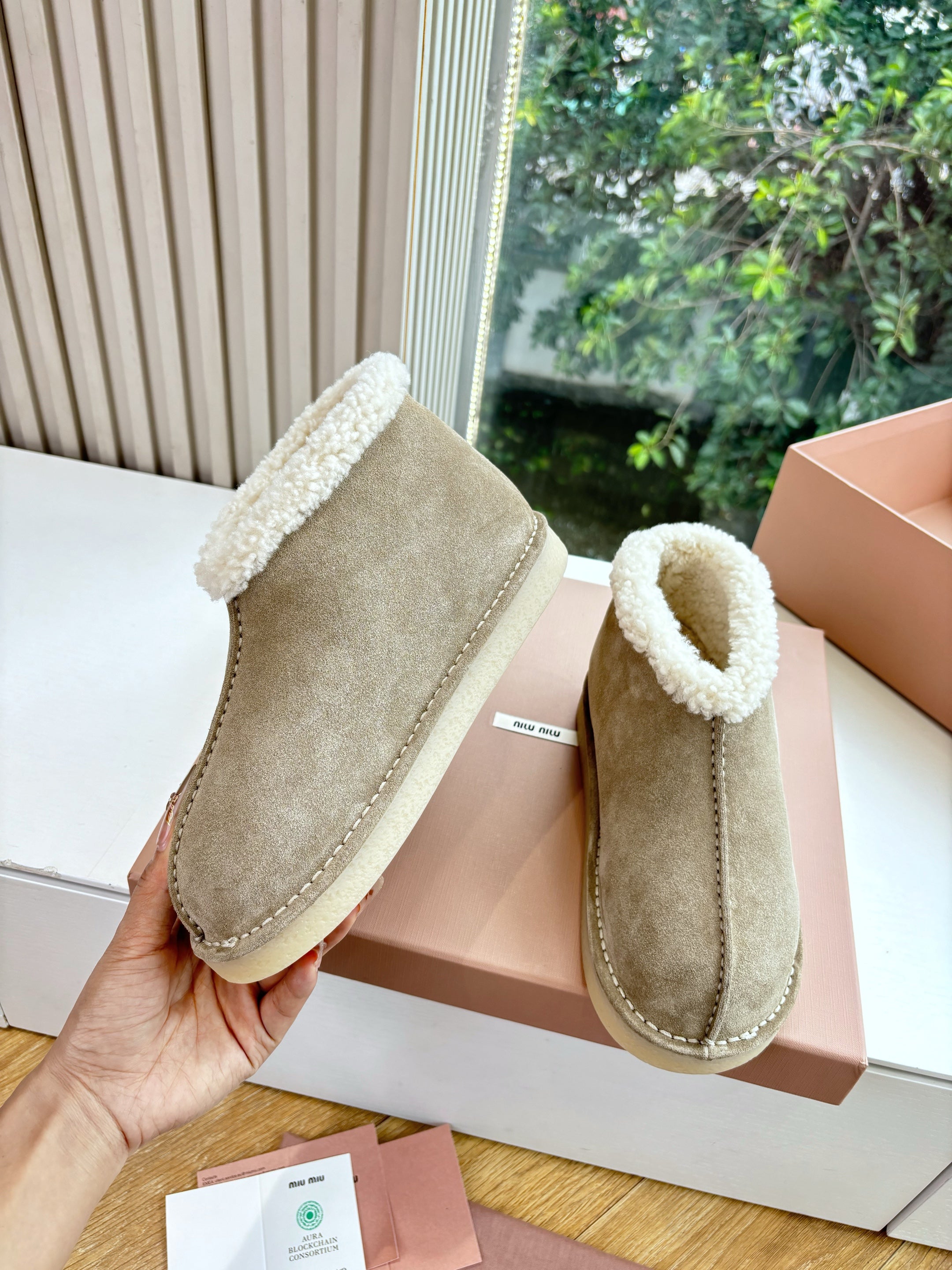 Miu FW25 Snow Boots Taupe White Wool Suede 506650
