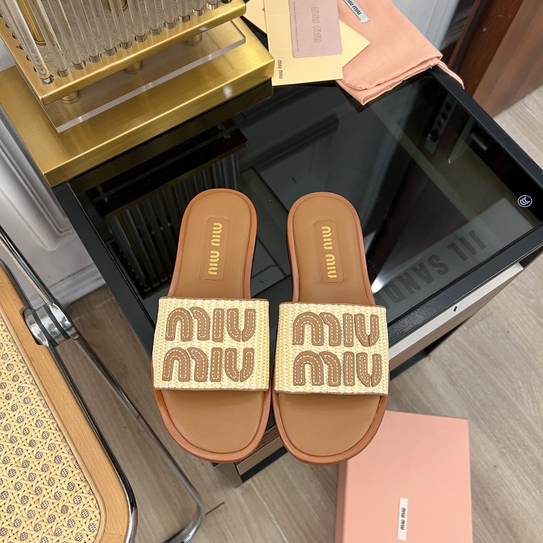Miu 25S Beige and Gold Canvas and leather slides 678740