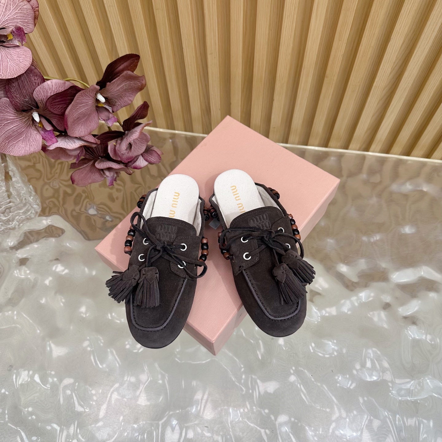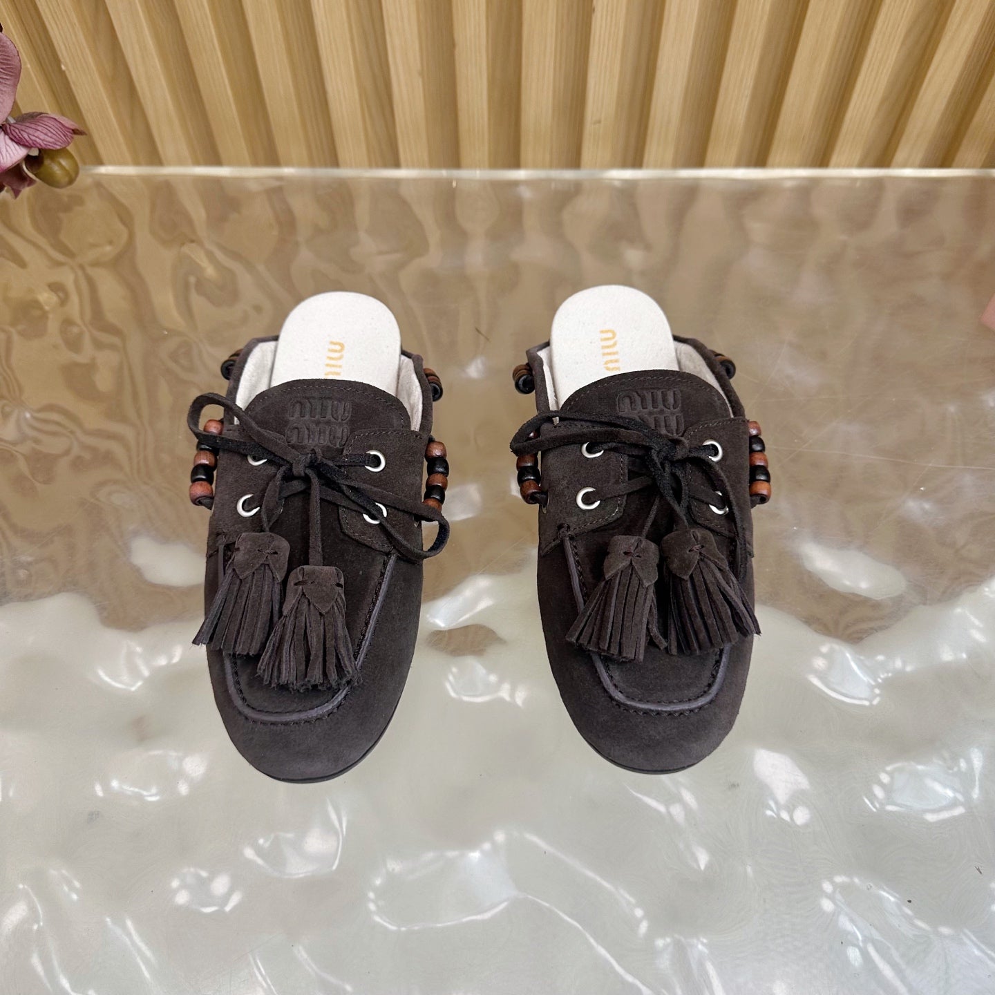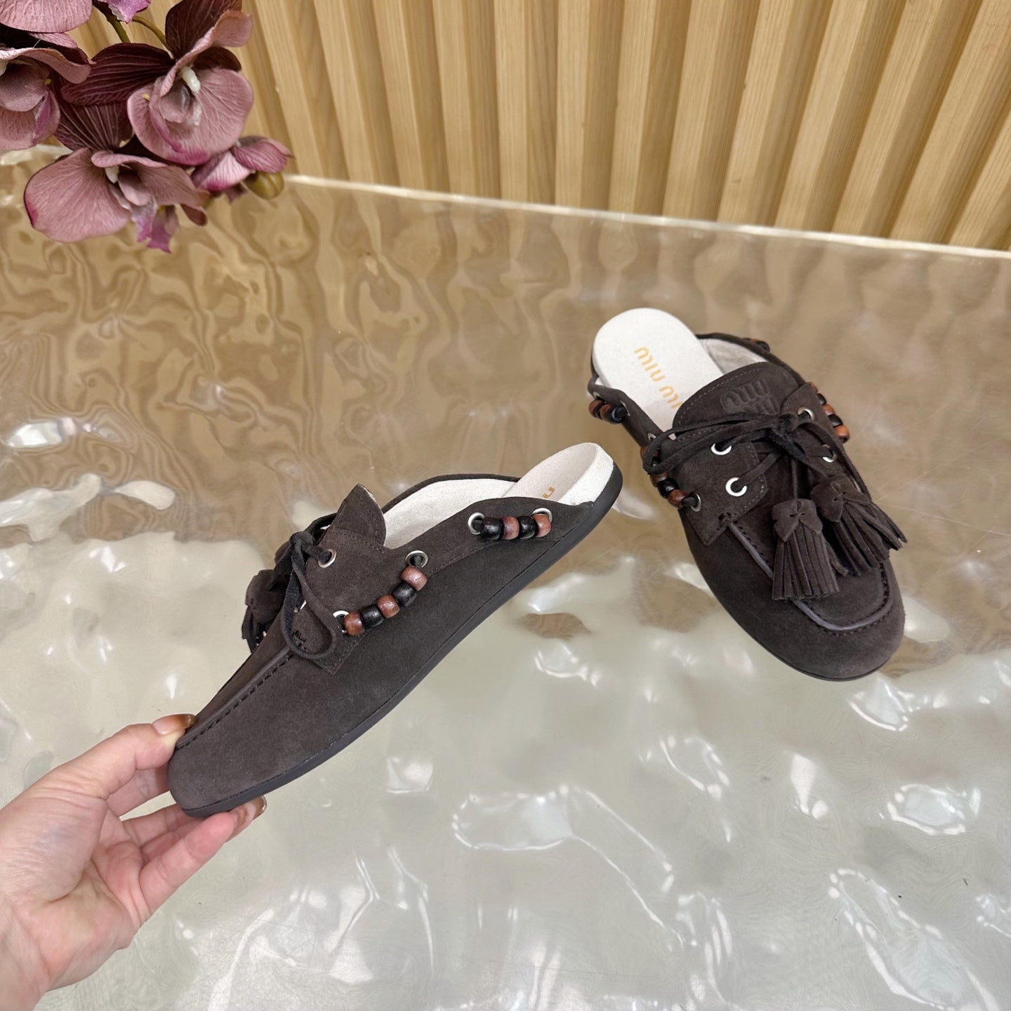 Miu Laces Eyelet Flat Half Slipper Dark Brown Suede 498163