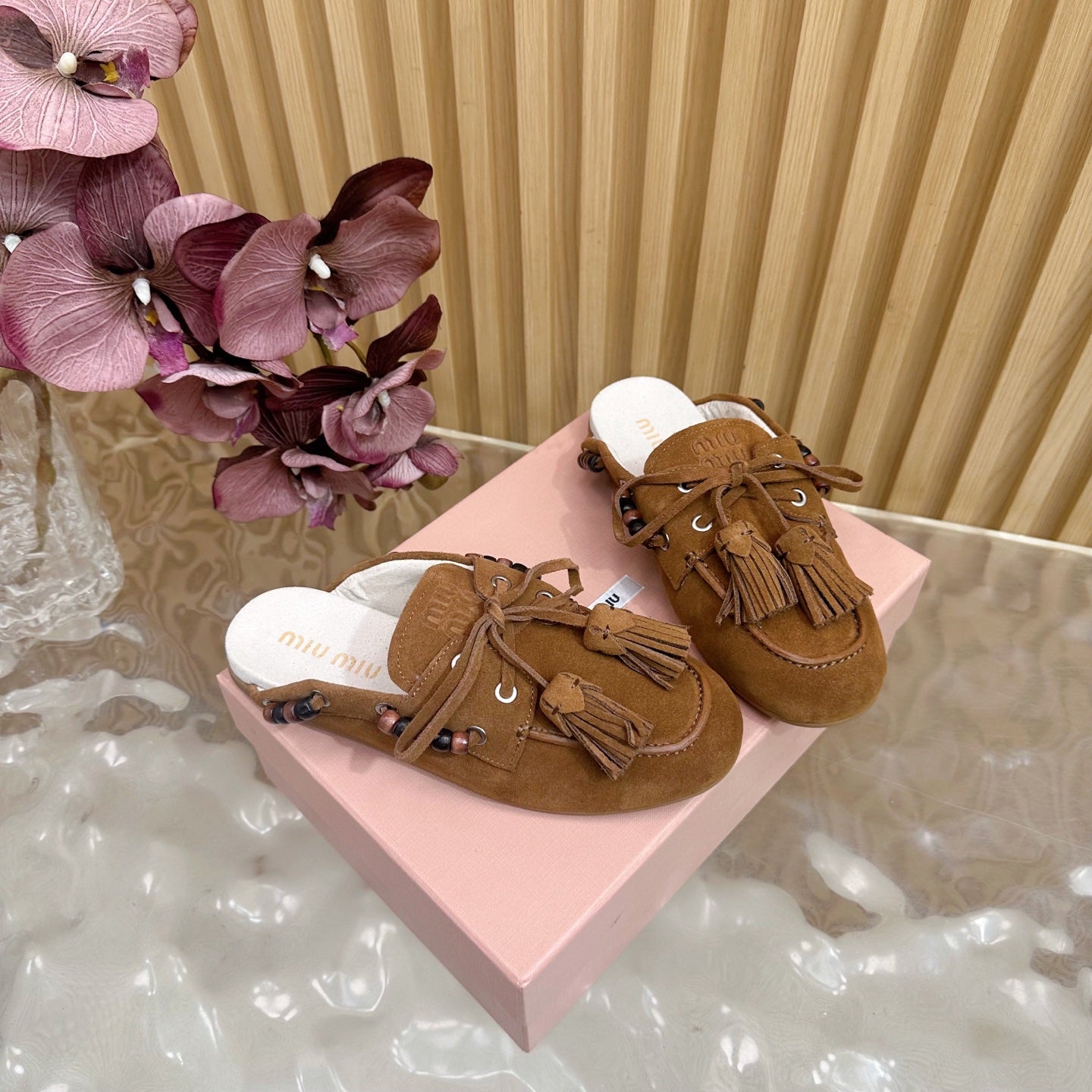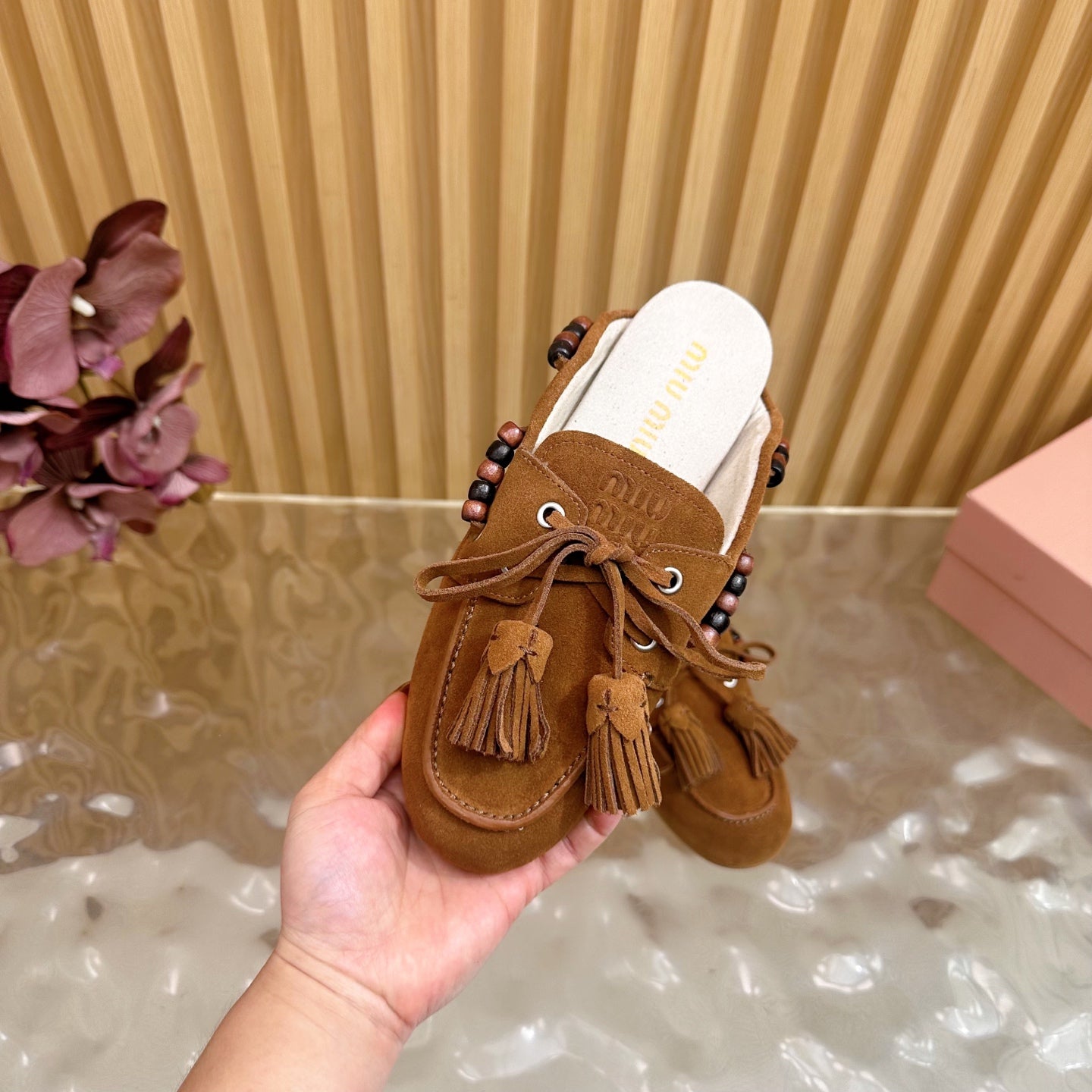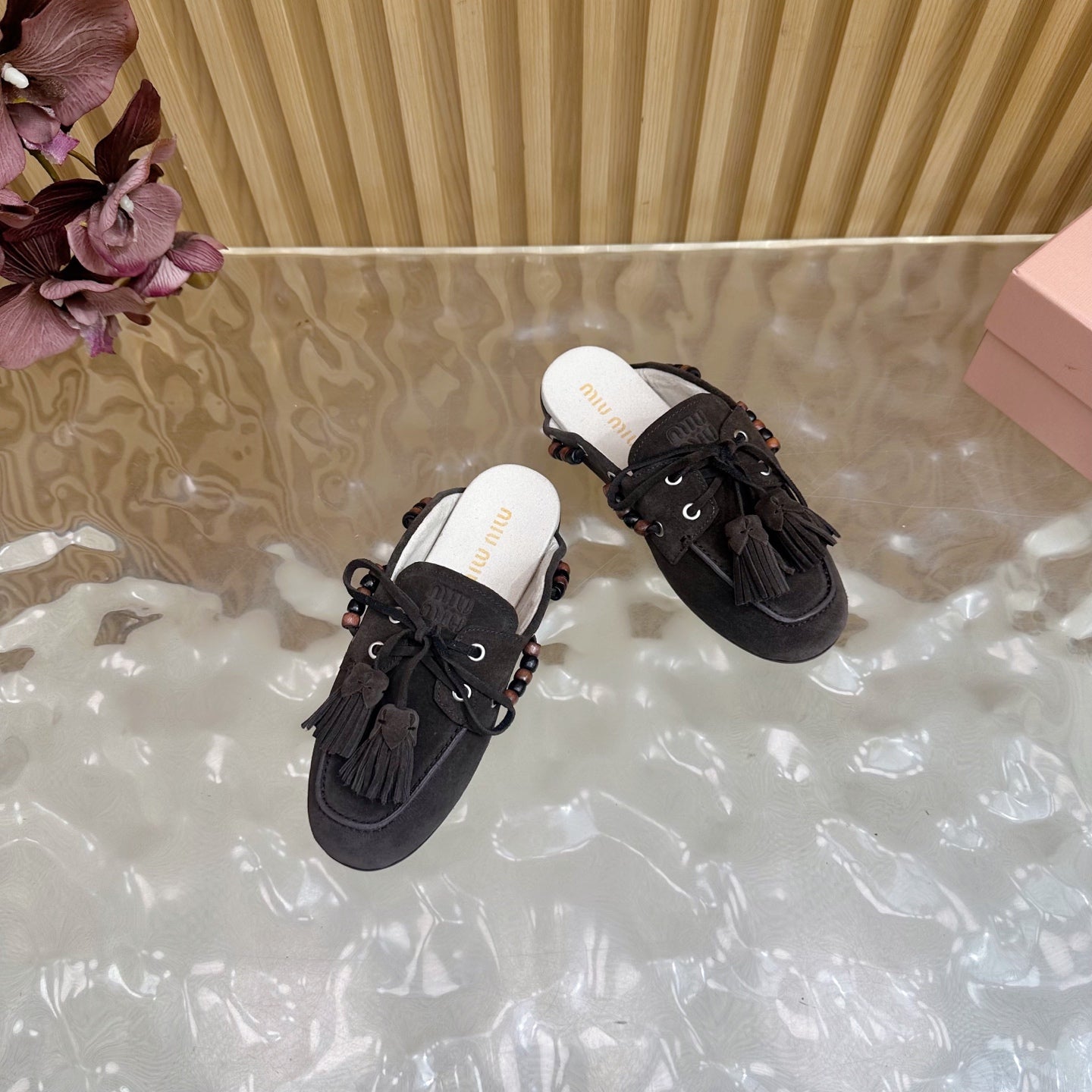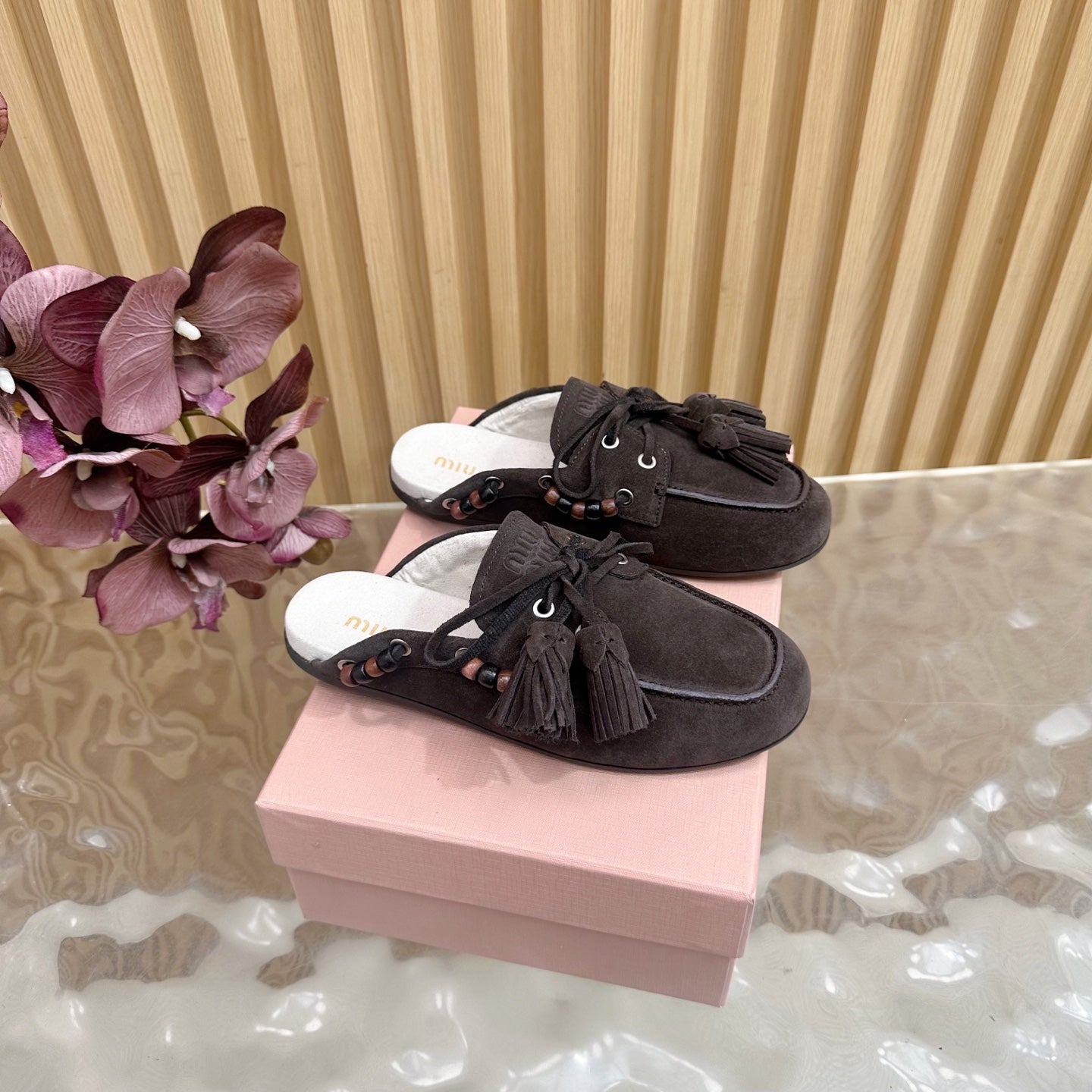 Miu Laces Eyelet Flat Half Slipper Dark Brown Suede 498163