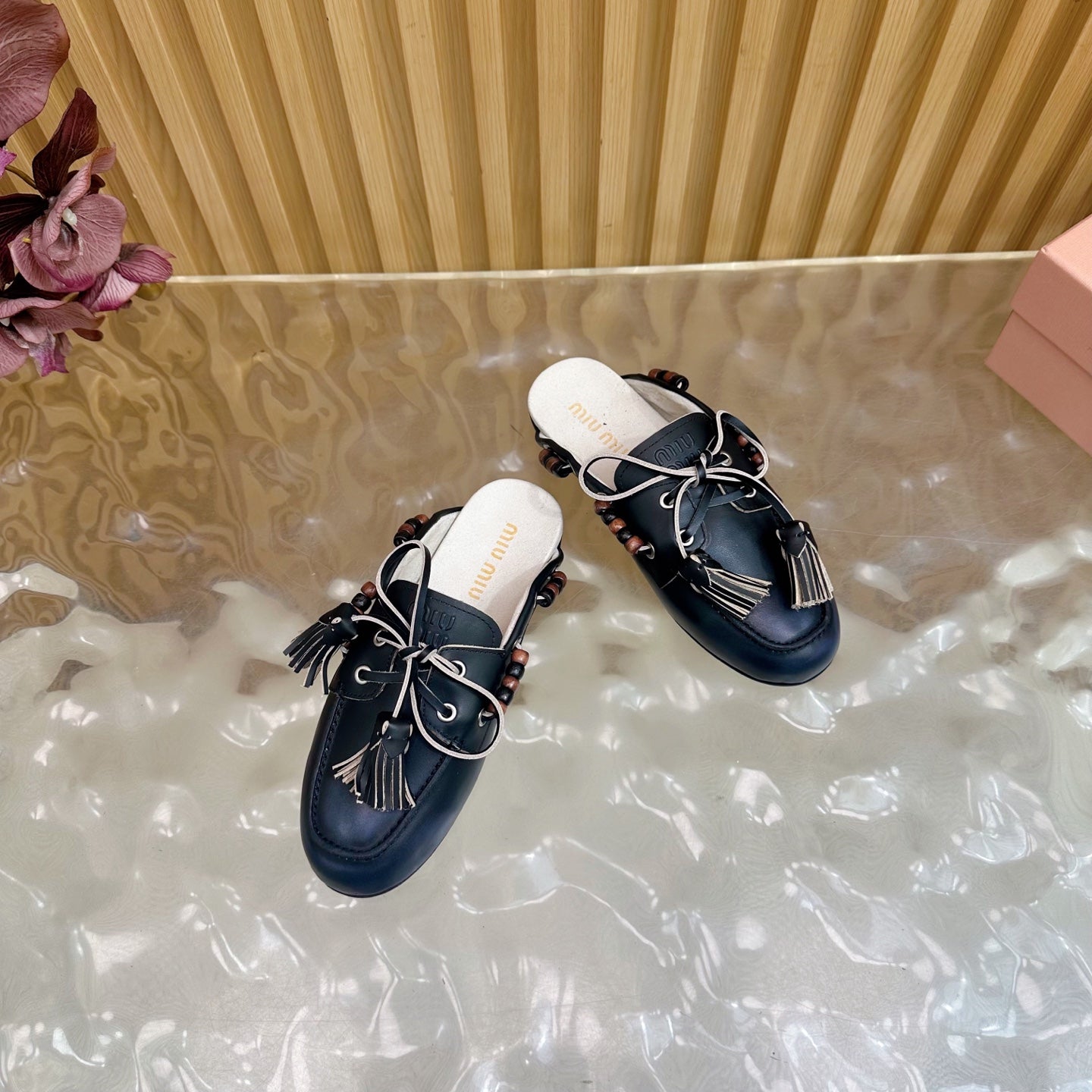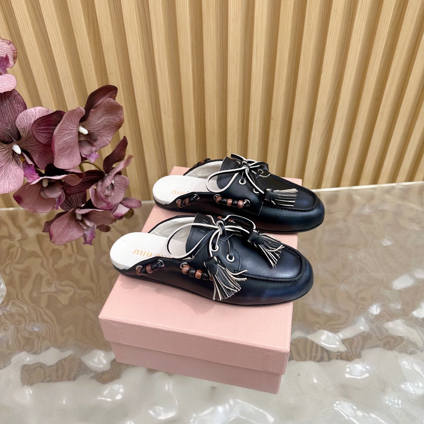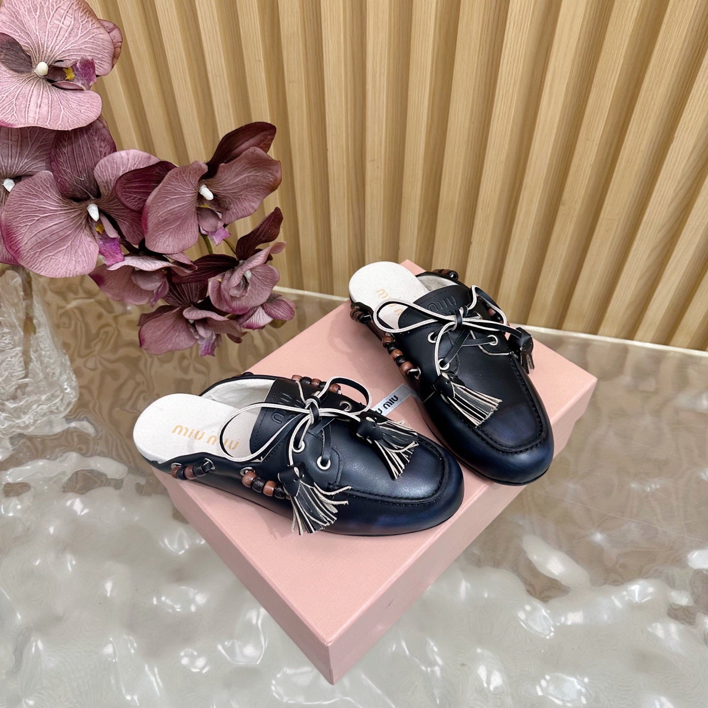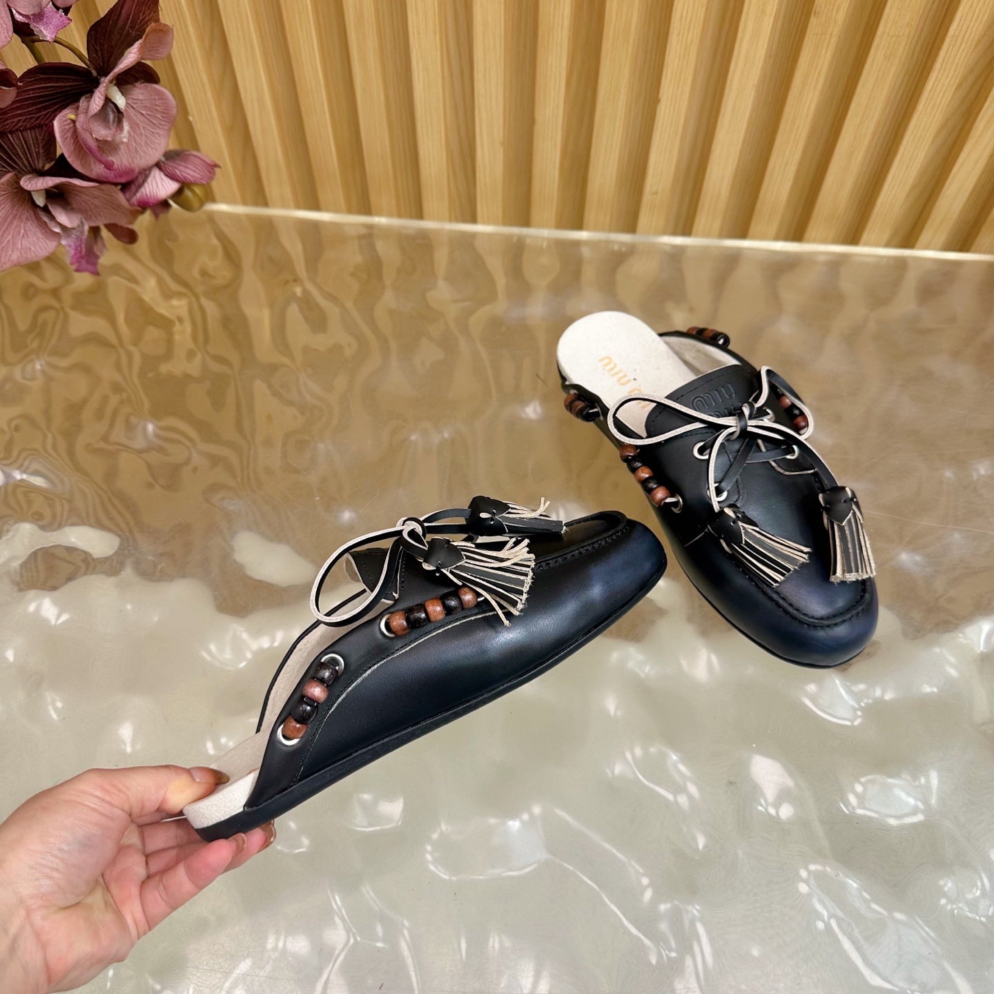 Miu Laces Eyelet Flat Half Slipper Black Sheepskin 498164