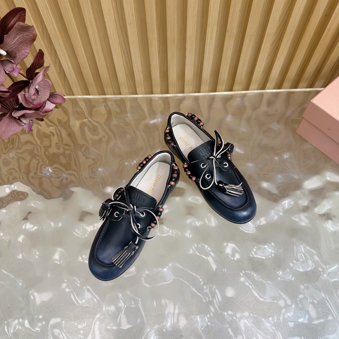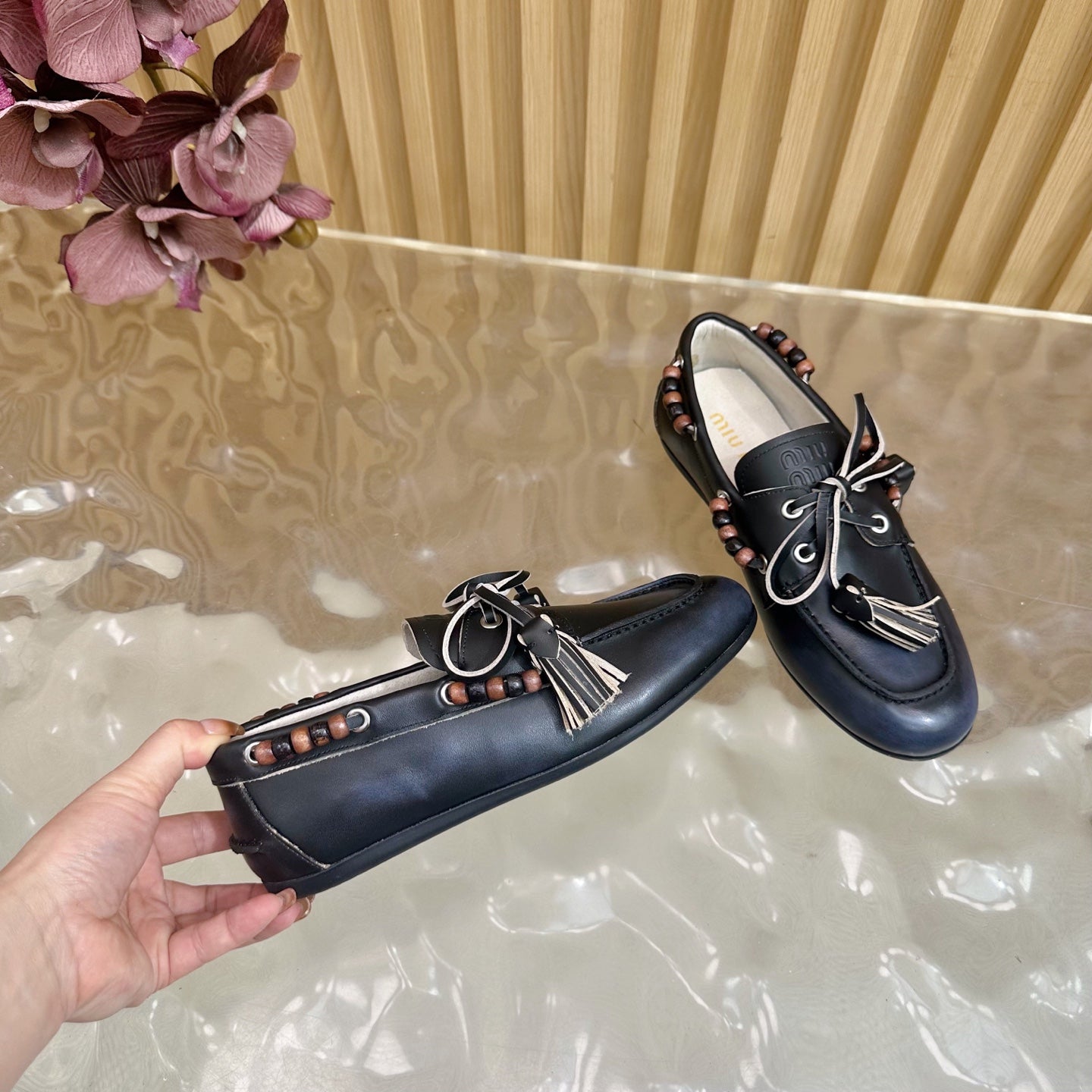 Miu Laces Eyelet Flat Loafer Black Sheepskin 498170