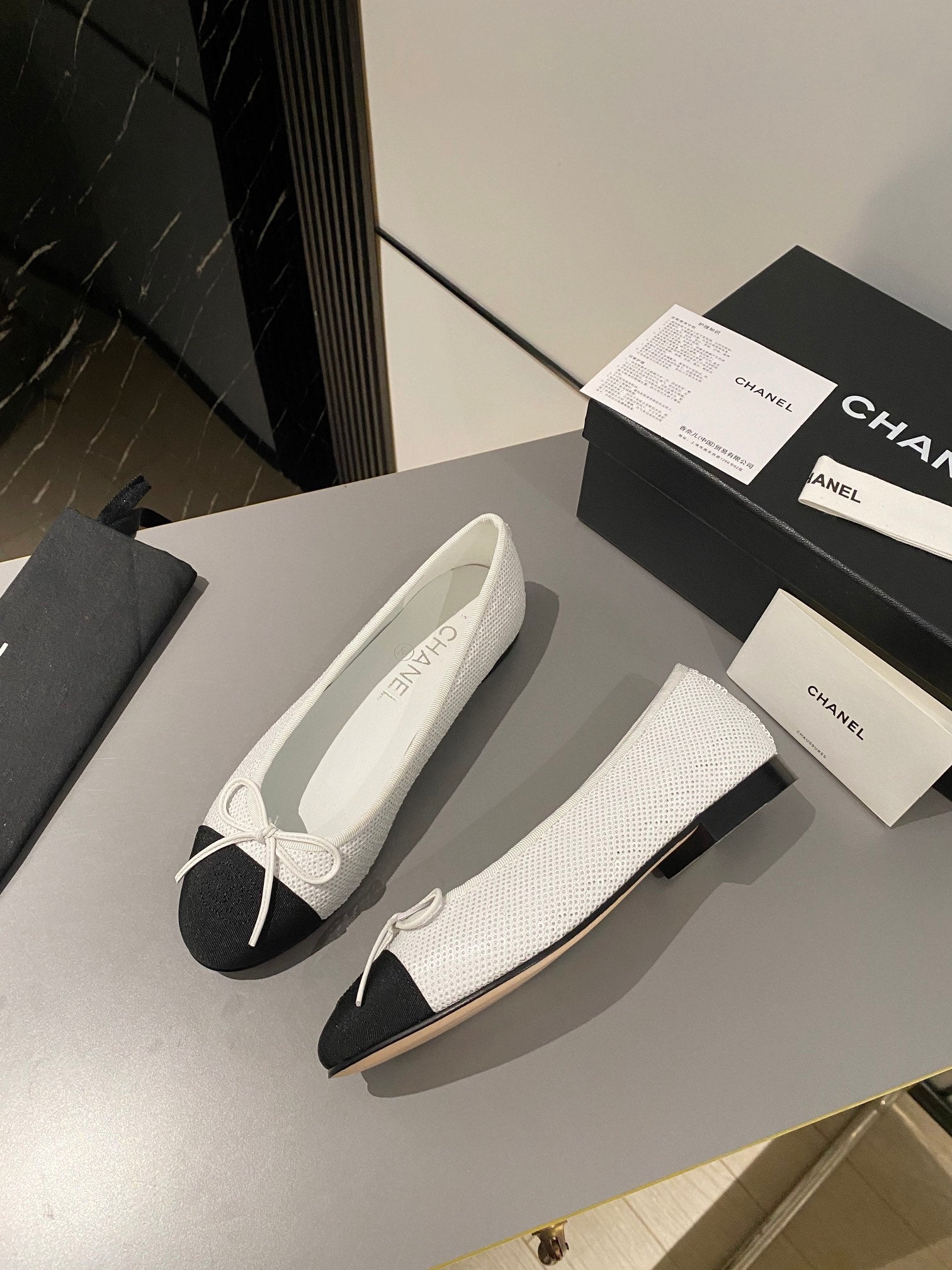 ballet flat white glitter sequins black grosgrain