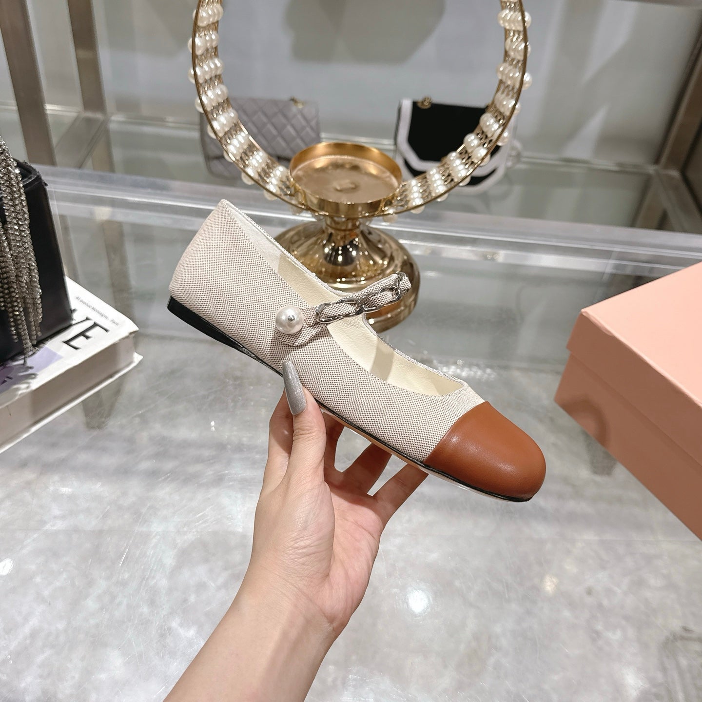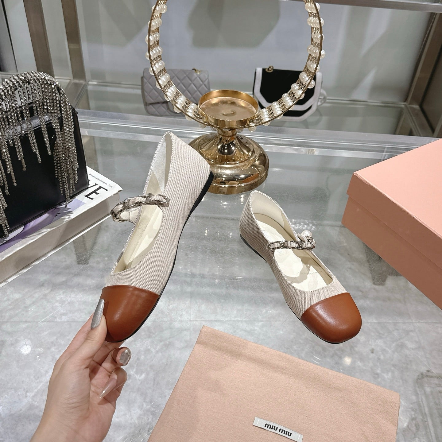 Miu 25C Mary Jane Flat Beige Cream Mix Brown Fabric 235369