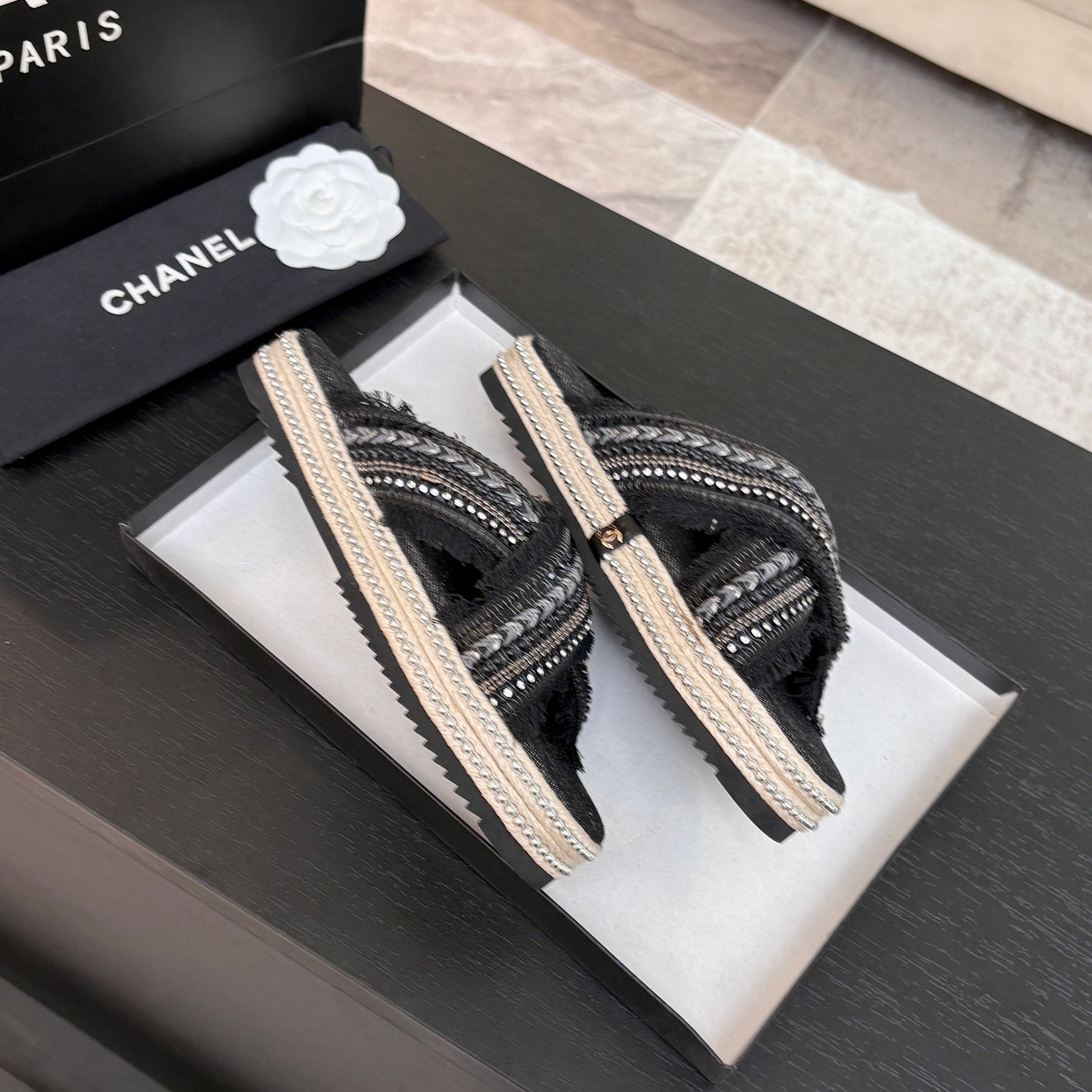 CC 25C Slippers Black Satin Fabric 212979
