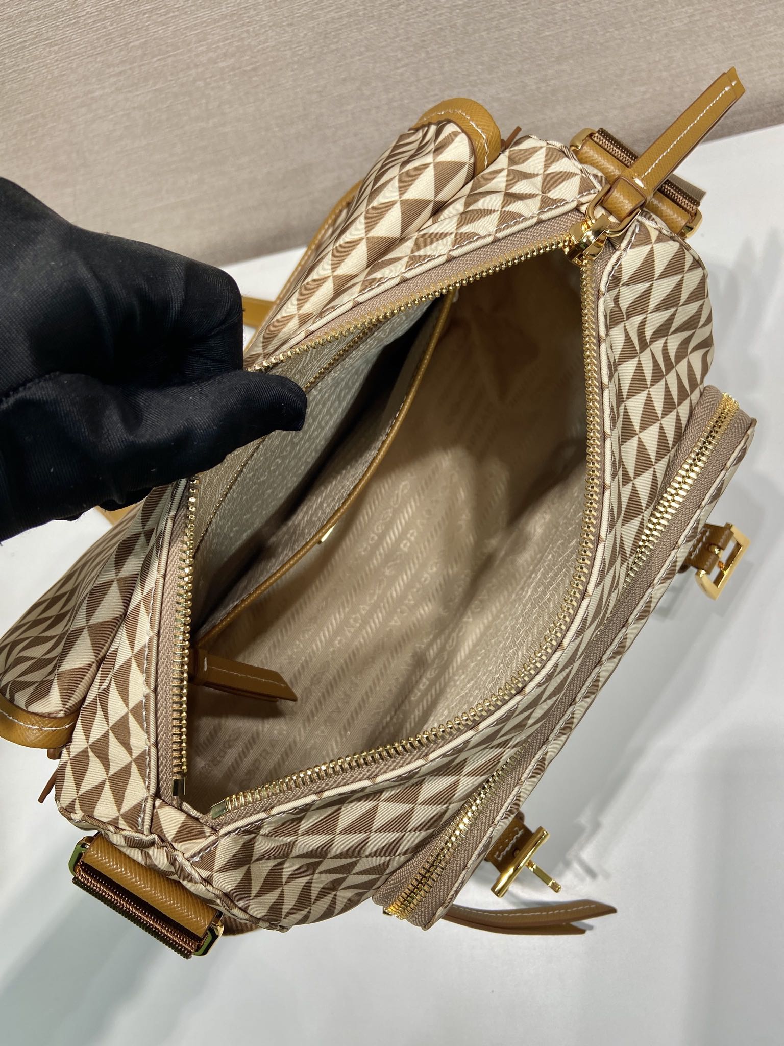 MESSENGER BAG 25 IN BROWN MIX CREAM TRIANGLE PATTERN EMBROIDERED FABRIC