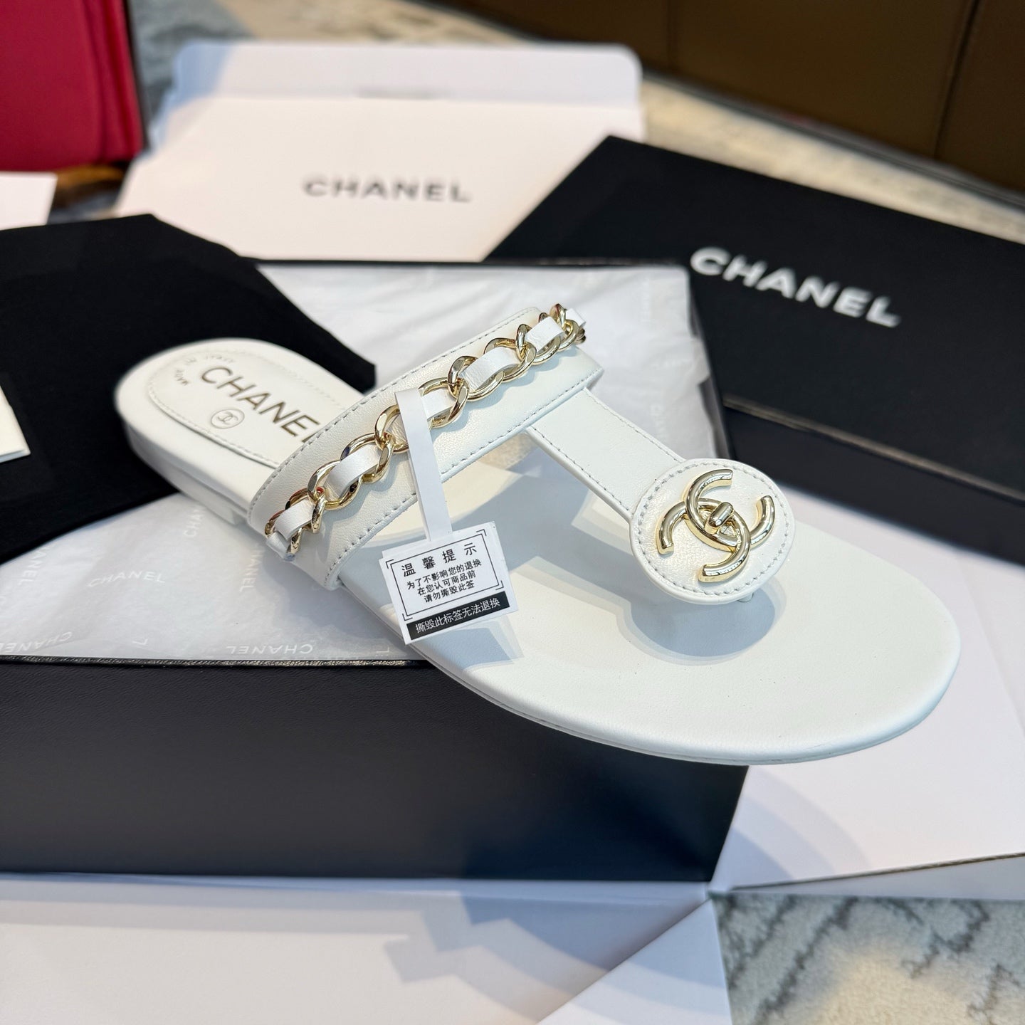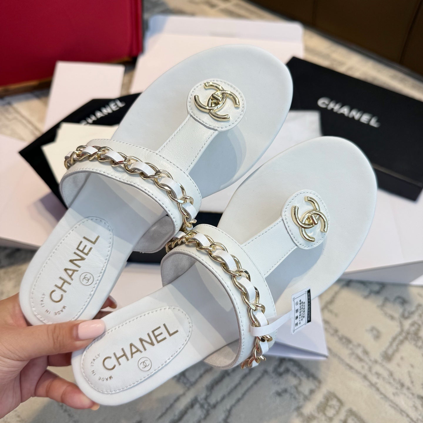 CC 25SS Thong Sandal 2cm Leather Chain White Lambskin 319699
