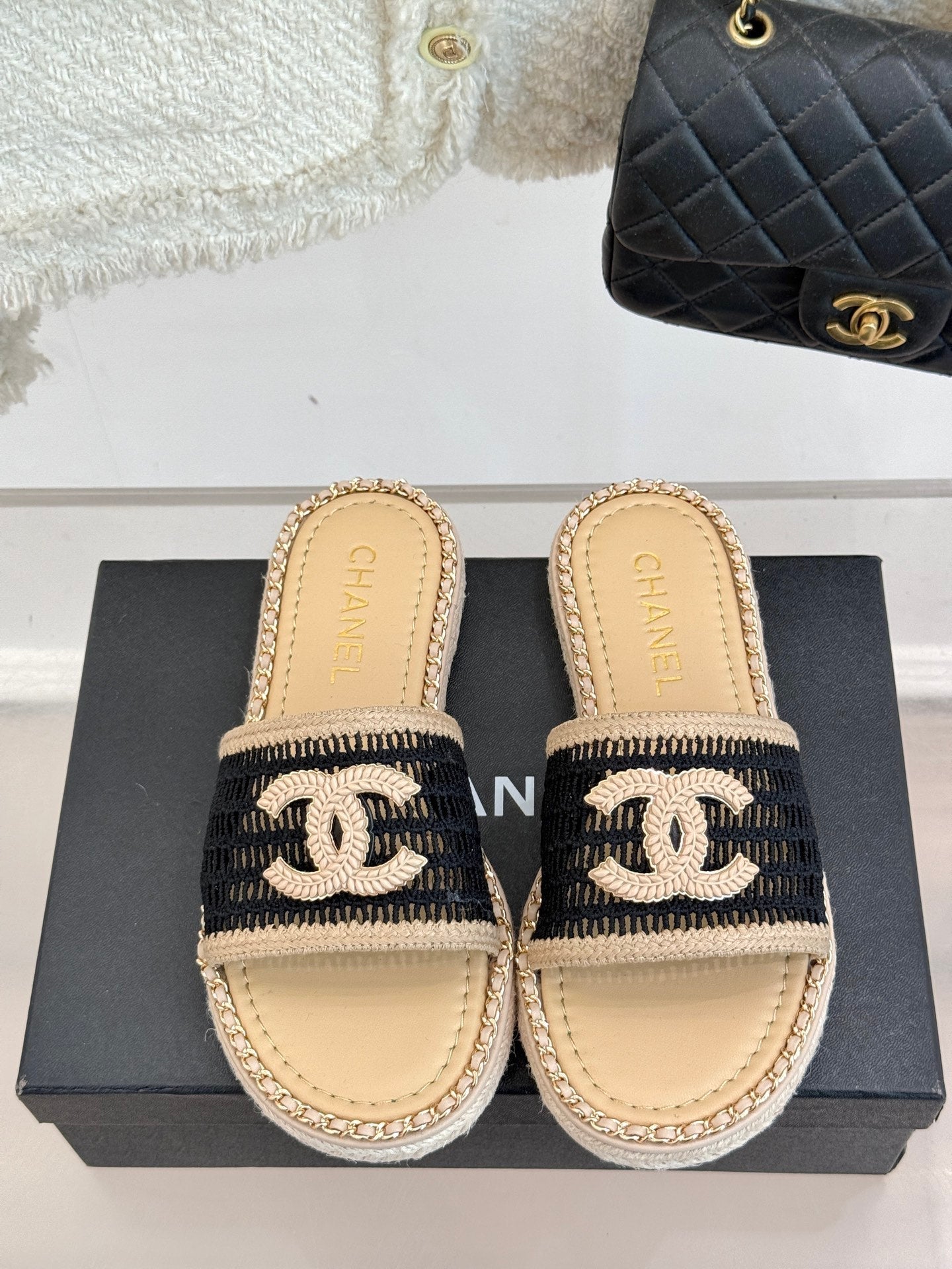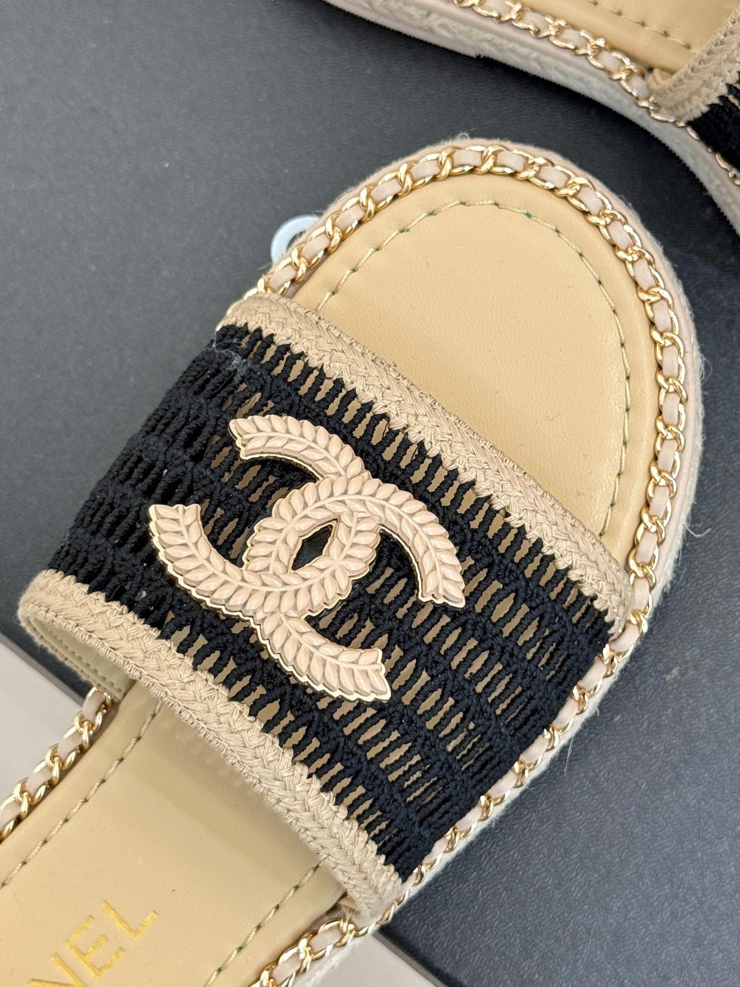 CC Mesh Hollow Chain Double C Thick-Soled Slippers 20mm Beige Black 265646