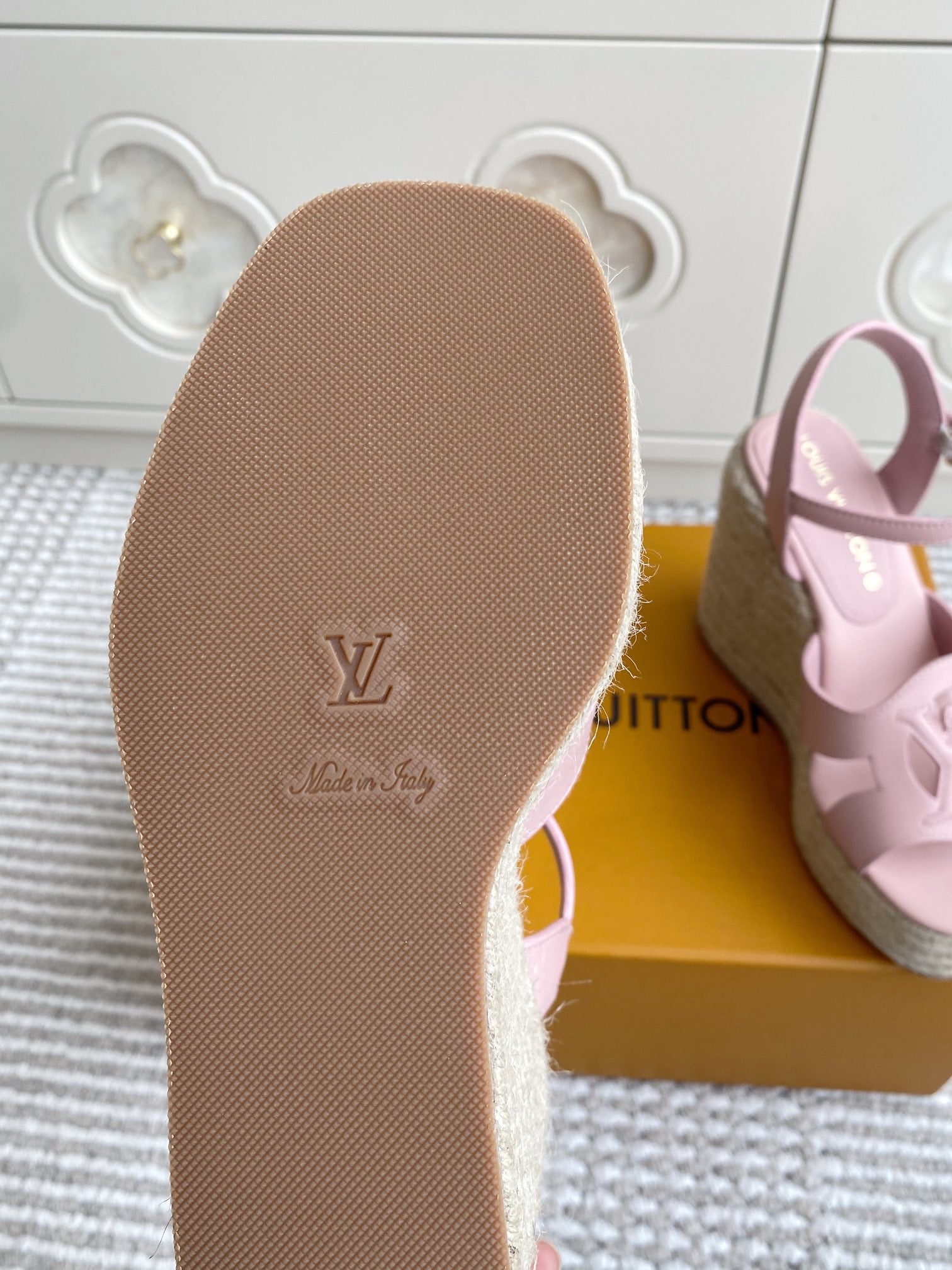 LV Letter Hollow Straw Wedge Sandals 11.5cm Pink Cowhide 291575