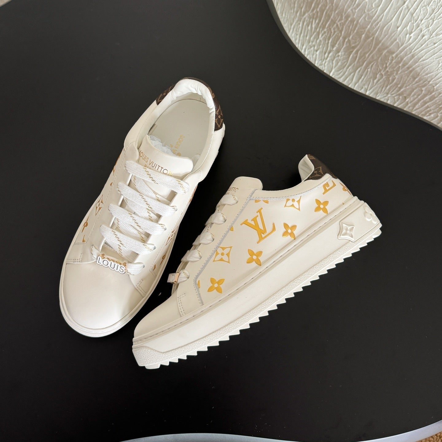 LV Sneakers Time Out White Shoes Gold Monogram Calfskin