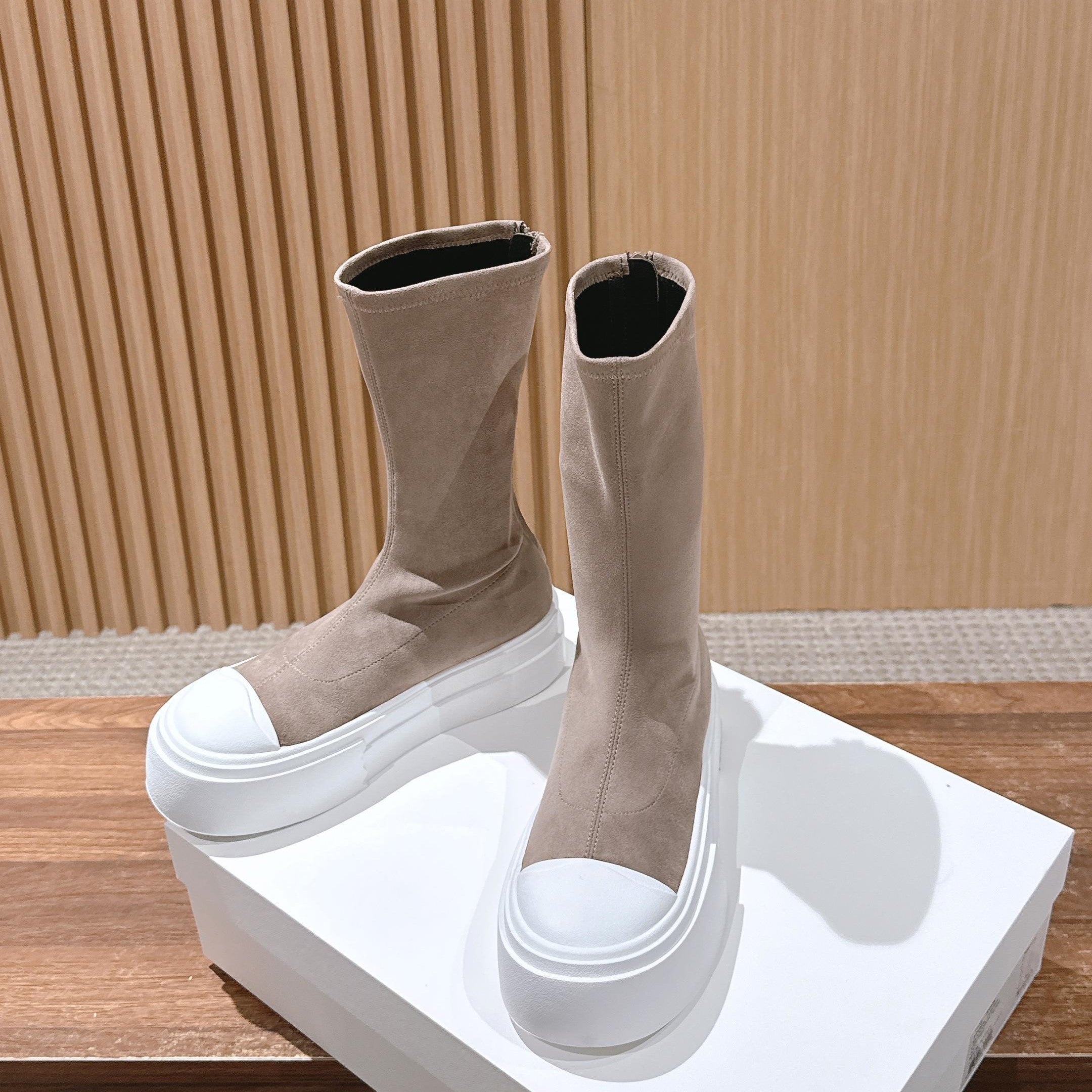 The Row Thick-soled Classic Round Toe Stretch Boots Light Brown White Suede 444174