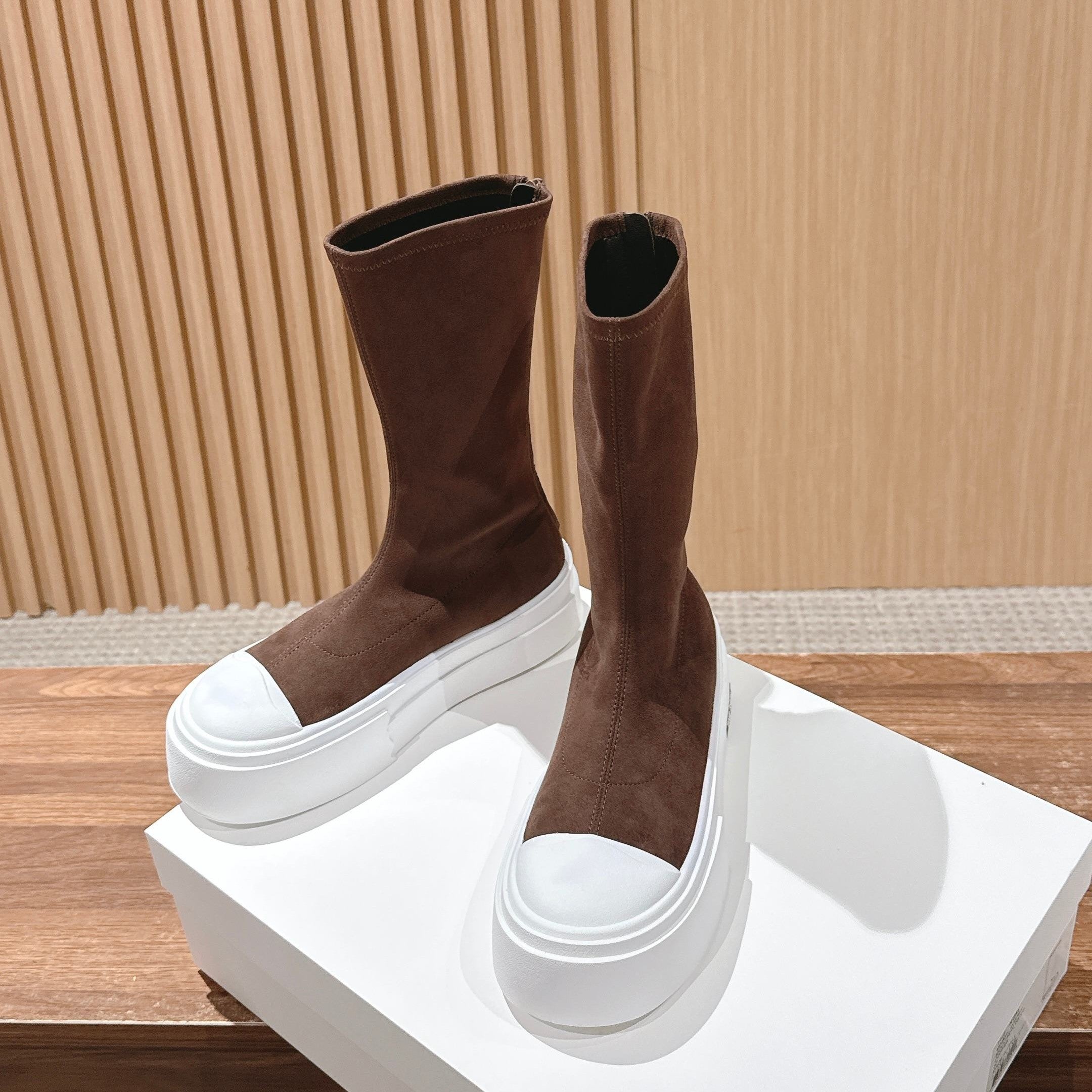 The Row Thick-soled Classic Round Toe Stretch Boots Brown White Suede 444175