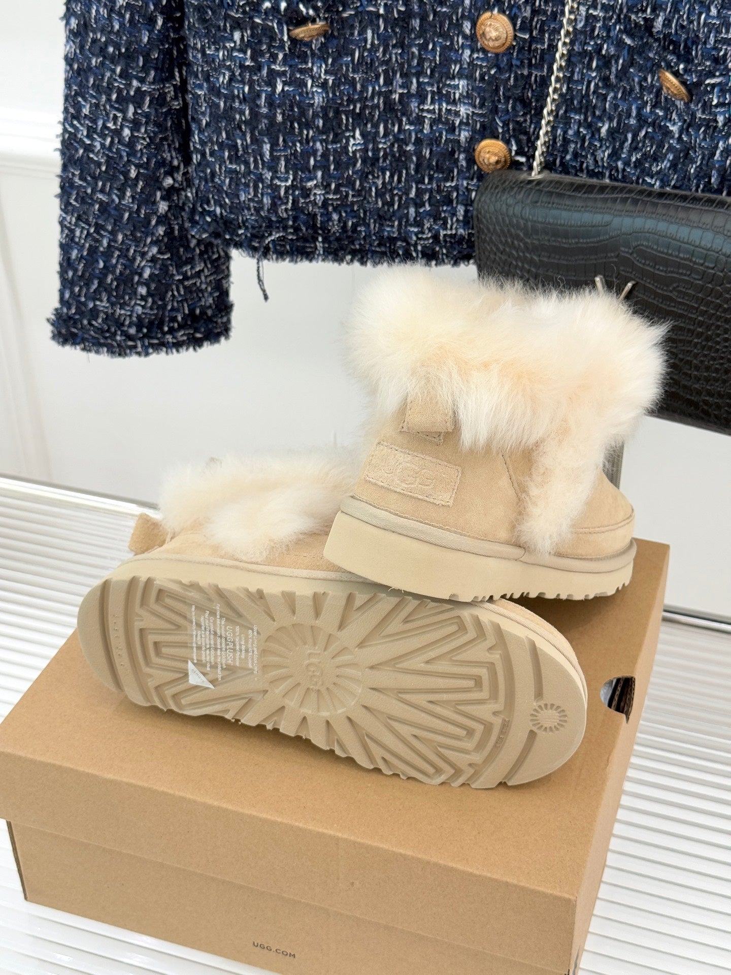 UGG Classic Ultra Mini Chalet Boots Muted Beige Suede Sheepskin Cuff 517489