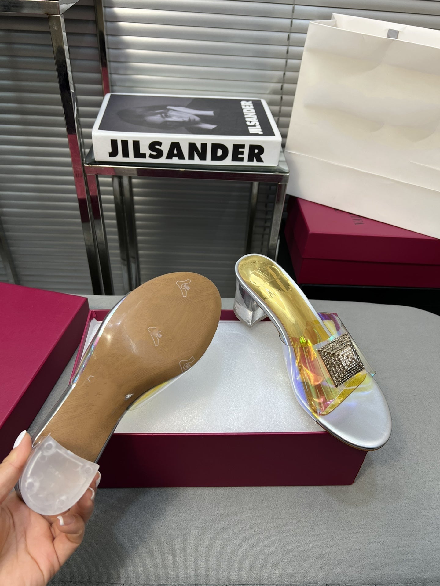Heeled Sandals 6cm with Crystal Square Buckle Gold and Silver