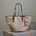 TOTE BAG 47 IN WHITE CANVAS AND BROWN LEATHER TRIM GOLD HARDWARE