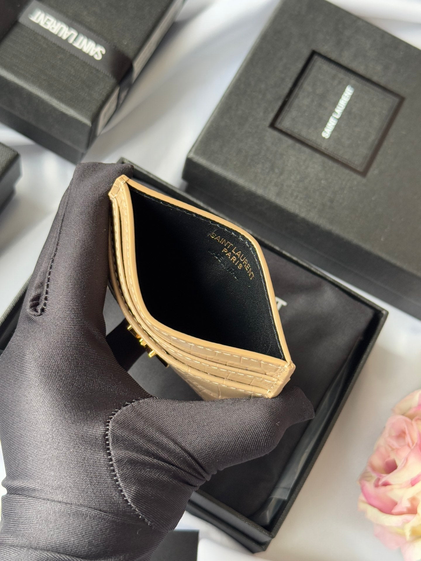 YSL Card Holder 10cm Wallet Beige Gold Crocodile Leather 240555