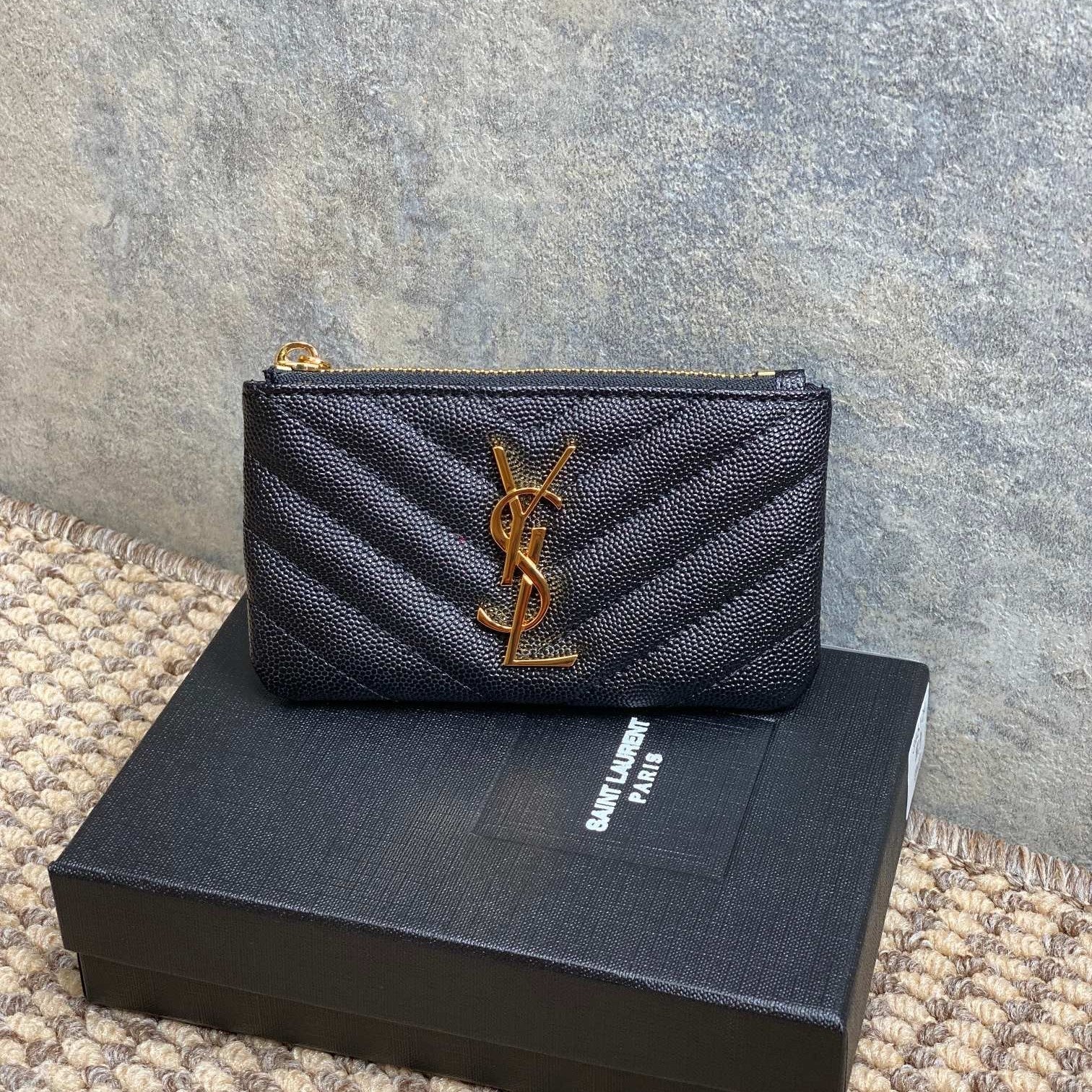 YSL Zip Coin Case With Card Full Black Caviar Cowhide GHW