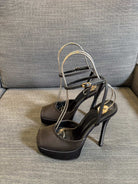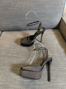 LA SCANDALE PLATFORM SANDALS IN TAUPE BROWN SATIN