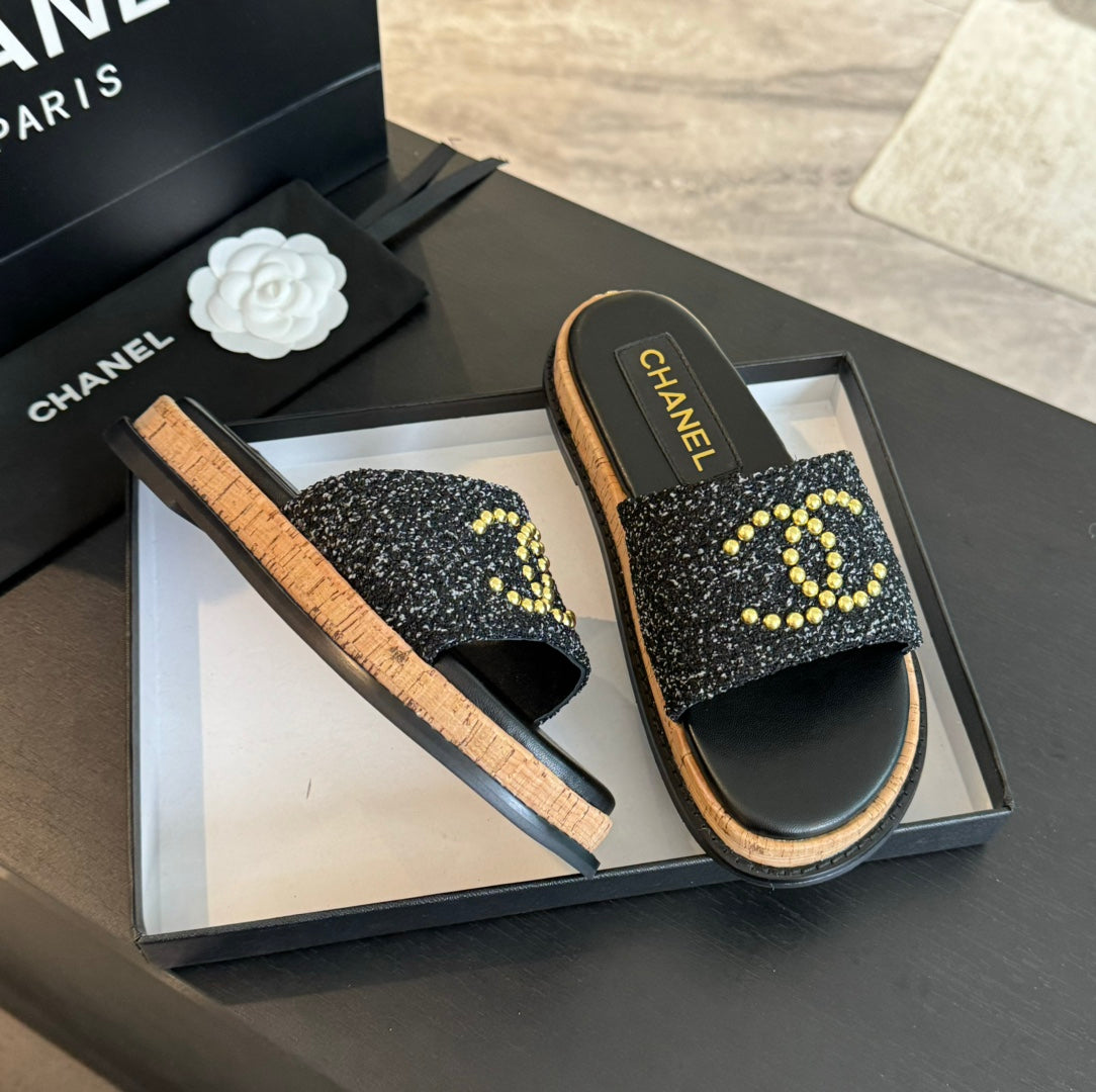Double C Wood Grain Platform Slippers Black Wool